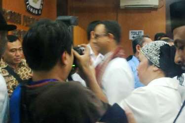 Kedatangan Anies dan Sandiaga datang selang 30 menit setelah pasangan cagub DKI Jakarta Agus Harimurti Yudhoyono dan cawagub DKI Jakarta Sylviana Murni meninggalkan lokasi usai mendaftar ke KPUD DKI Jakarta.