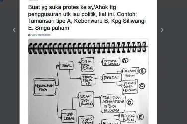 "Buat yang suka protes ke saya/Ahok tentang penggusuran untuk isu politik, lihat ini," tulis Ridwan di akun Twitter-nya, Selasa (27/9/2016), di atas gambar sebuah diagram tentang "Kekumuhan Kota"