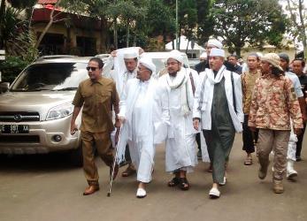 Okeline, Jabar - Pagi ini Rizieq Shihab bersama rombongan kuasa hukumnya tiba di Gedung Reskrimum Polda Jawa Barat, Senin (13/2/17) sekitar pukul 09.05 WIB, Pemimpin Front Pembela Islam ini mengenakan jubah putih dan sorban.