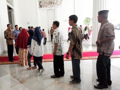 Memasuki ruangan Istana Negara, mereka pun tampak berbaris mengantre untuk berjabat tangan dengan Presiden Jokowi dan Wakil Presiden Jusuf Kalla.