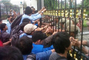 Puluhan demonstran dari Badan Eksekutif Mahasiswa (BEM) Universitas Riau (UR) menggelar aksi unjukrasa di bundaran Tugu Selais dan depan kantor Gubernur Riau (Gubri), Selasa (24/4/12). Mereka mendesak KPK memeriksa Gubri Rusli Zainal dalam kasus supa PON.