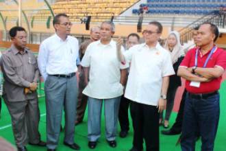 Gubernur Riau HM Rusli Zainal didampingi Plt Kadispora Riau Emrizal Pakis serta Ketua Umum PSSI Dr Johar Arifin, Direktur Timnas PSSI Bernard Limbong meninjau persiapan penyelenggaraan kualifikasi piala Asian Football Confederation (AFC) U-22 Championship 2013 di Stadion Utama Riau di komplek kampus Unri Panam, Pekanbaru, Riau.