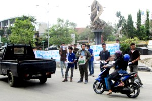 Belasan aktivis Himpunan Mahasiswa Amanat (HMA) menggelar aksi simpatik, mengumpulkan koin dari pengguna jalan Jenderal Sudirman Pekanbaru untuk membantu pembangunan gedung Komisi Pemberantasan Korupsi (KPK).