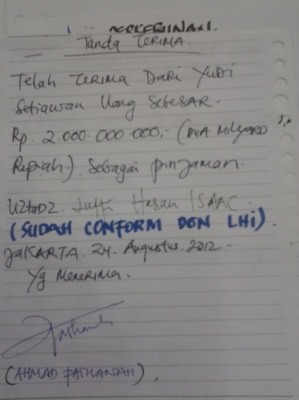 "Ada permintaan dari Fathanah bahwa Luthfi butuh uang untuk THR DPP PKS. Klien kami memberikan Rp 2 miliar untuk THR DPP PKS. Memang ada Rp 2 miliar untuk THR DPP. Penyerahan uang itu diambil juga lewat bank BJB. Ini melalui cek BJB, yang satu cek Rp 950 juta kemudian transfer 2 kali," sebutnya.