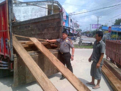 Kapolsek Pangkalan Kerinci Kompol. Arwin menyaksikan pemindahan Barang Bukti (BB) Ilog kayu olahan bentuk papan konsen yang akan di amankan di Mapolsek Pangkalan.Kerinci dengan tersangka AS (28 th).