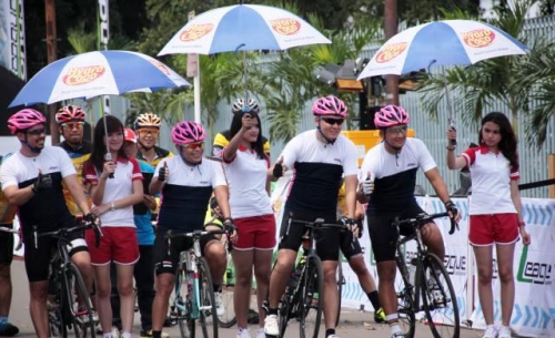 Gadis payung (Umbrella Girls) mendampingi para pembalap sepeda JIExpo Criterium 2014 di area parkir barat JIExpo Kemayoran, Jakarta, Minggu (26/1)
