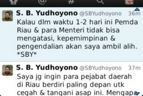 Hal itu disebutakan SBY dalam akun twitternya S.B. Yudhoyono?@SBYudhoyono yang ditweet sekitar pukul 21.30 WIB. "Kalau dlm waktu 1-2 hari ini Pemda Riau & para Menteri tidak bisa mengatasi, kepemimpinan & pengendalian akan saya ambil alih," tegasnya.
