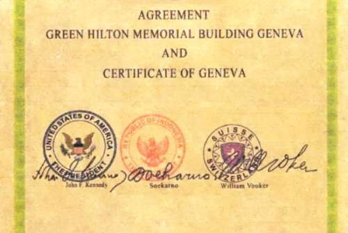 The treaty called " Green Hilton Memorial Agreement Geneva " . The world's most expensive Deed signed by John F. Kennedy as U.S. President , Ir Soekarno as President and William Vouker representing Switzerland . This triangular agreement made ??at the Hilton Geneva on 14 November 1963 as a continuation of the MOU conducted in 1961. The point is , the U.S. Government recognizes the existence of gold bars worth more than 57 thousand tons of pure gold which consists of 17 packets of gold and Indonesia received the gold bullion it becomes collateral for the U.S. financial world that its operation conducted by the Swiss Government through the United Bank of Switzerland ( UBS ) .