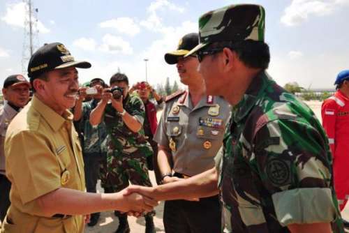 Mayjen Iskandar M Sahlidi sambut Bupati Bengkalis, Herliyan Saleh di lapangan Pasir Andan Dewi Kota Bengkalis, Selasa (25/3). Dalam kunjungan itu, Wadan Satgas didampingi Sekretaris Utama BNPB, Fatchul Hadi, Kapolda Riau Brigjen Pol Condro Kirono, Sekdaprov, Zaini Ismail dan beberapa pejabat Provinsi Riau lainnya. [rudi]