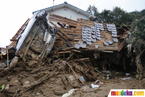 Sejumlah mobil dan bangunan rumah setelah longsor melanda wilayah Asaminami, Hiroshima, Jepang, Rabu (20/8/14), luluh lantak, sedikitnya 36 warga, termasuk anak-anak tewas dan puluhan rumah dan kendaraan terkubur material longsor.