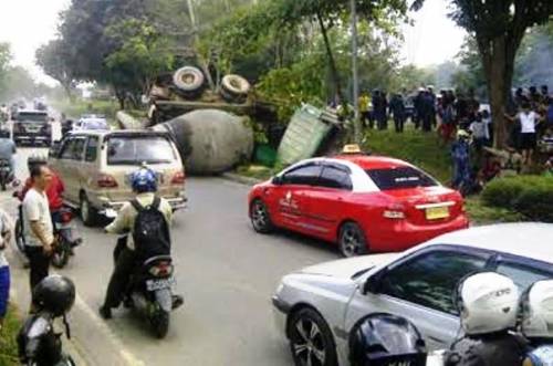 Okeline, Batam - Truk molen di turunan Kelurahan Tiban Kampung, Rabu (28/10/14) sekitar pukul 14.20 WIB tiba - tiba terguling, truk bernomor polisi BP 9563 DY yang dikendarai Rusnanto.