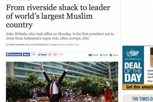 Media ini juga menceritakan kisah Jokowi yang turun dari mobilnya, lalu menaiki kereta kuda dalam perjalanan menuju istana negara. Times of Israel menyebut ini adalah pertama kalinya dalam sejarah Indonesia pelantikan presiden dirayakan dengan ramai.