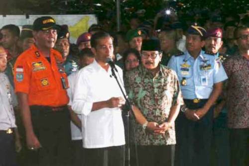 "Saya terima kasih dan apresiasi kepada Basarnas, TNI, Polri, masyarakat nelayan atas dukungan yang diberikan dalam rangka pencarian pesawat penumpang dan awak," kata Presiden Jokowi saat berkunjung ke Posko Crisis Center di Terminal II Bandara Juanda, Surabaya, Jawa Timur, Selasa (30/12/2014).