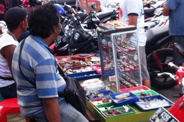Ramai Pedagang batu akik mangkal diantara kerumunan warga di sekitar Pelabuhan Wijaya Pura, Cilacap, Nusakambangan Selasa (28/4/2015) petang.