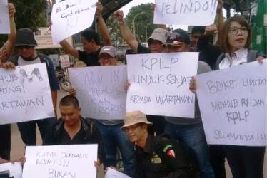 Para pewarta berunjuk rasa lantaran tidak diperbolehkan meliput kedatangan Menteri Perhubungan Republik Indonesia, Ignasius Jonan yang berkunkung ke KPLP tersebut.