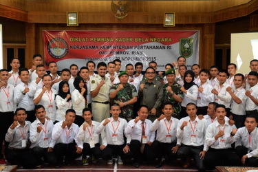 KABARRIAU.COM, Pekanbaru - Danrem 031/Wirabima Brigjen TNI Nurendi M.si ( Han) didampingi Kepala Kesbang Polinmas Propinsi Riau Hardi Basuki.Memberikan materi Bela Negara kepada 100 anggota Diklat yang berasal dari Polri, Pemuda, Mahasiswa, Pramuka, Menwa dan Ormas yang tersebar di 12 Kabupaten/Kota se Propinsi Riau,Mereka pada (9/11/2015) mulai mengikuti Diklat Pembina Kader Bela Negara yang bekerjasama dengan Kementrian Pertahanan RI dan Pemerintah Propinsi Riau.
