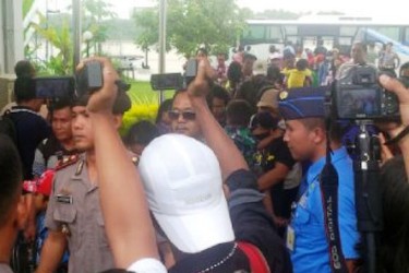 KABARRIAU.COM, PEKANBARU - Hari Senin (8/2/2016) sore, sekitar pukul 15.15 WIB, rombongan eks anggota Gerakan Fajar Nusantara (Gafatar) asal Provinsi Riau akhirnya mendarat di Bandara Sultan Syarif Kasim II Pekanbaru dengan pesawat Batik Air. Sebagian menutup wajahnya saat berjalan menuju bus dinas sosial.