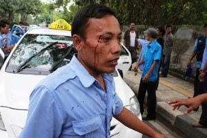 Driver ojek online dengan sopir taksi pendemo di Jalan Sudirman, tepatnya di dekat Hotel Le -