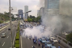 Sopir taksi membakar 3 ban yang ditumpuk menjadi satu, tak ayal jalan sepanjang lokasi demo -