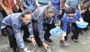 Presiden Susilo Bambang Yudhoyono (SBY) bersama ibu Ani Yudhoyono mengambil beberapa ekor penyu -