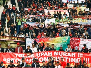 Jakarta - Aparat kepolisian mengadang ribuan buruh peserta aksi unjuk rasa dalam rangka -