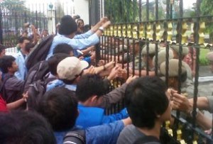 Puluhan mahasiswa dari berbagai Perguruan Tinggi di Pekanbaru akhirnya merusak pagar tugu -